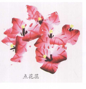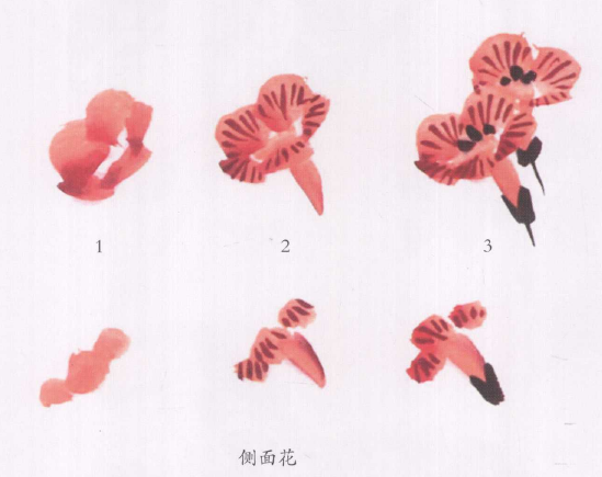 花筒画法:笔上蘸朱磦汁后,将笔锋刮扁,笔毫两侧少蘸胭脂倒着用笔画花筒,使笔根部分与花冠相连;画侧面花,先点花冠、画花筒、勾花脉、再用浓墨点写花托。