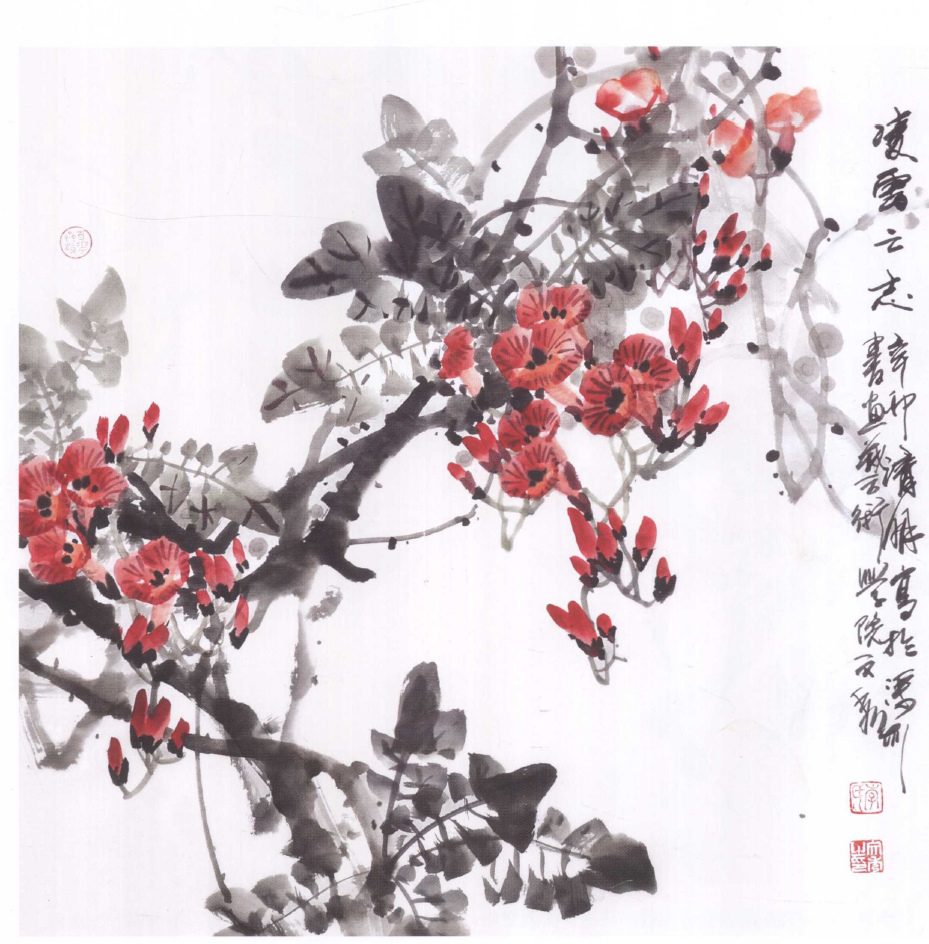 步骤一:画花、花苞、连花轴。布局要注意画面的聚散和疏密,使颜色分散,使画面红色基本平衡,穿梗要注意每组花之间的变化,要有顾盼关系。