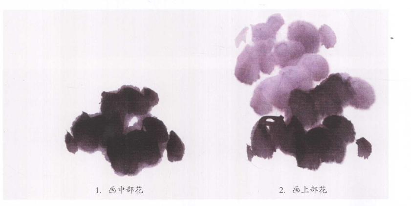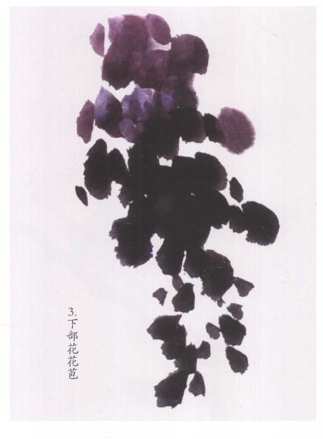 底部花:将笔重新蘸水湿润,再饱蘸花青加胭脂,调成深紫色;在中部花下方补画更为深色的花,注意疏密,注意外部形状要留有缺口。